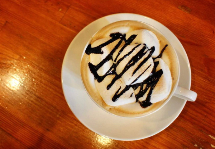 コーヒーの上にホイップとチョコソースがのっています。